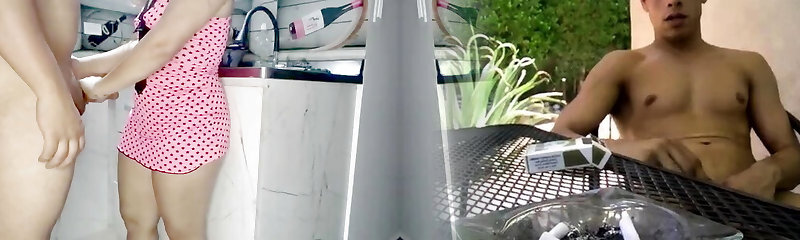 Stepmom is surprised by her sonnie and sticks her big cock in the kitchen